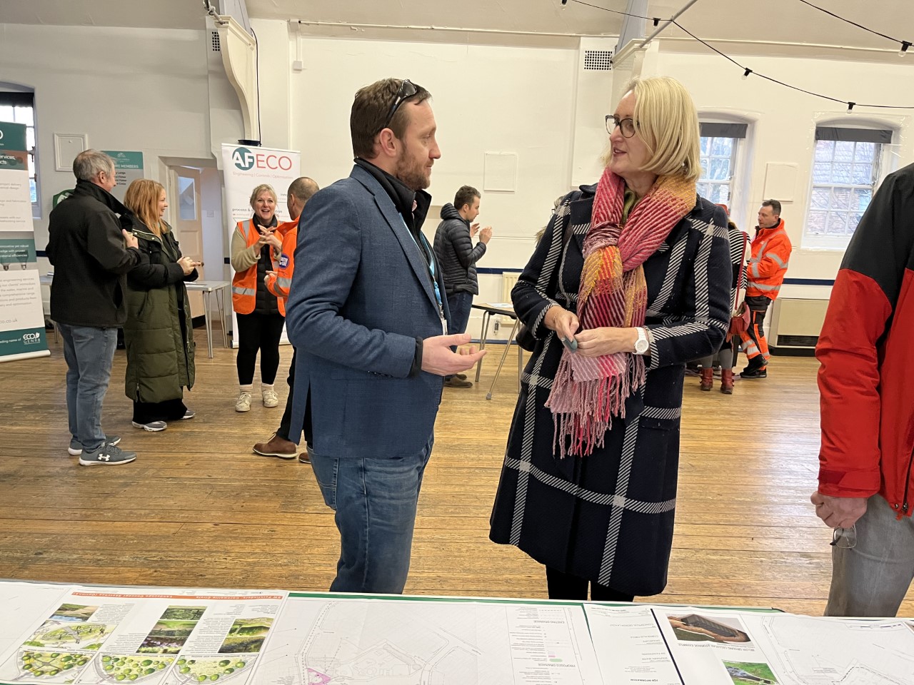 Members of the public gathered at Whitstable Umbrella Community Centre on Saturday 21 January 2023 for a drop-in event to hear about progress made by the Swalecliffe (Whitstable) pathfinder project – one of six initiatives across the Southern Water region trialling innovative and nature-based solutions to slow the flow of rainwater entering the sewage system.